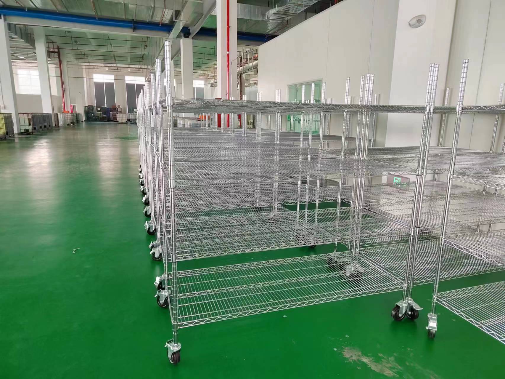 南通某精密電子公司,防靜電置物架驗收結(jié)束,每層配置金屬夾片,黑色防靜電腳輪。